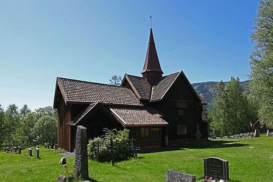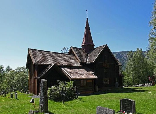 Rollag Stave Church was probably originally built in second half of the 12th century. It was first mentioned in written sources in 1425. Rollag Stave Church is decorated with a mixture of artistic expressions from a series of periods from the early Middle Ages.