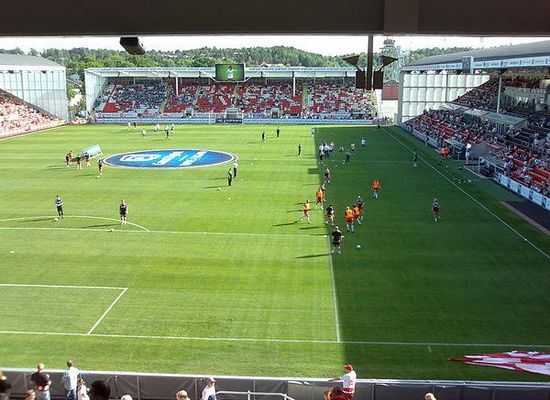 The Fredrikstad Stadion is a football stadium in Fredrikstad, Norway and home of the Norwegian First Division team Fredrikstad FK. It is located in an area which formerly used to be a large shipyard , but which nowadays is the technological centre of the city, with several companies and a college. The frontage of the stadium is built to replicate the original halls of the workshop. This makes it architecturally unique. The stadium was built to replace Old Fredrikstad Stadion, which was considered to be one of the eldest and most worn-out stadium in the country. The total capacity is approximately 12,560, all seated. There is a possibility to expand it furthermore, to some 15,000 seats.