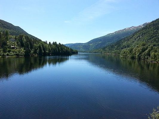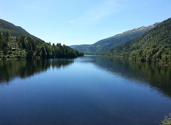 Norefjorden is a lake in the municipality of Nore og Uvdal in Buskerud county, Norway. Norefjorden is a long, narrow mountain lake which is known for its fishing. Numedalslågen flows into the far north and exits travelling southward to Kravikfjorden. Norefjord bridge goes across the lake between Norefjord and Gvåle. The surrounding terrain is steep and forested.