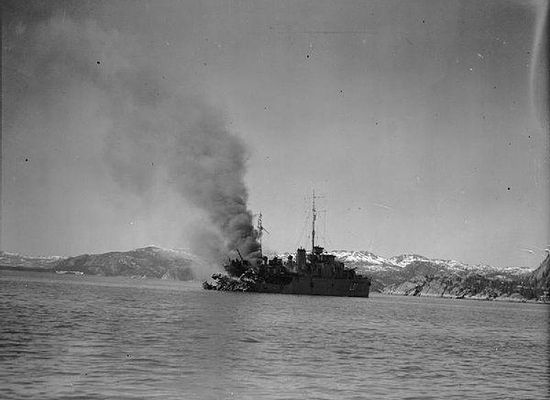 She served in Home waters and off the coast of Norway during the Second World War. She took part in the ill-fated Namsos Campaign of 1940, where she was used to defend allied troop ships entering and leaving Namsos harbour from submarine attacks. The harbour came under regular air attack by the Luftwaffe, and on 30 April, Bittern was spotted and mistaken for an Allied cruiser by a squadron of Junkers Ju 87 dive bombers. Bittern came under repeated attack from 0700 hours onwards. She was hit and severely damaged, being set on fire by a bomb dropped from Oberleutnant Elmo Schäfer's aircraft belonging to I./StG 1. Nearby allied ships came alongside and took the survivors off. When this had been completed, Bittern was sunk by a torpedo from the destroyer Janus.