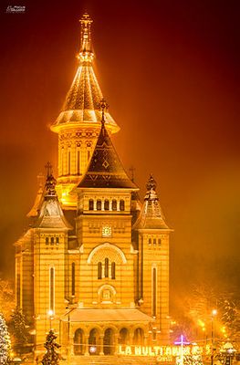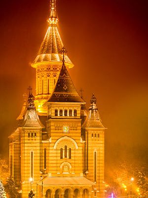 The Timișoara Orthodox Cathedral (Romanian: Catedrala Mitropolitană din Timișoara) is a Romanian Orthodox cathedral in Timişoara, in the historical Banat region, in western Romania. The cathedral is the seat of the Archbishop of Timișoara and Metropolis of Banat. It is dedicated to the Three Holy Hierarchs, Saints Basil the Great, Gregory the Theologian, and John Chrysostom. It has 11 towers, of which the central and the highest has a height of 90.5 meters. The Metropolitan Cathedral is listed in the National Register of Historic Monuments.