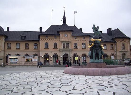 Uppsala Central Station is a railway station in Uppsala, Sweden. It lies on the East Coast Line, which runs south to Stockholm and north to Gävle and Sundsvall. It is also the southeastern terminus for the Dala Line which runs northwest ending in Mora. There are frequent commuter services to Stockholm. Long-distance trains, such as the SJ 3000, connect Uppsala to the northern parts of the country. Many trains, including the Stockholm commuter rail , also leave the main line to connect Uppsala with Stockholm-Arlanda Airport. Next to the station is a hub for the regional coach services operated by Upplands Lokaltrafik. Many local bus routes run through or near the station grounds as well, and there is a large area set aside for bicycle parking.