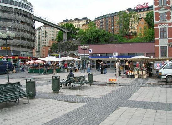 Slussen is a station of the Stockholm metro, located in Slussenområdet in the district of Södermalm. The station is served by the Red and Green lines. Originally opened in 1933 as an underground tram stop, on 1 October 1950 it became the terminal of the first metro line running south to Hökarängen, it was again rebuilt when the extension of the line north to Hötorget was opened on 24 November 1957. On 5 April 1964, the first stretch of the Red line, between T-Centralen and Fruängen, was opened.