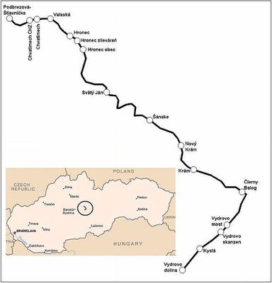 The Čierny Hron Railway is a narrow gauge railway in the Slovak Ore Mountains, built as a forest railway for logging operations.Planning for the railway began in 1898 and building began in 1908. In 1909 regular wood transport on the railway started, between Čierny Balog and Hronec. The network was extended to transport wood from the forests and by the middle of the 20th century the railway had a total length of 131,97 km, the most extensive forestry railway network in Czechoslovakia.