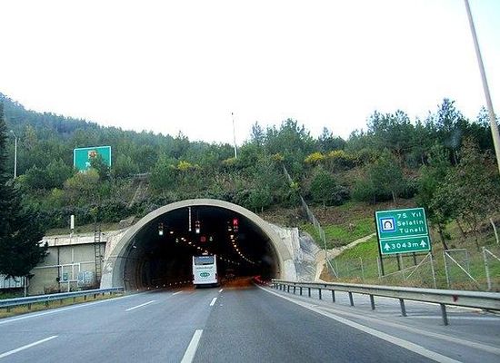 75th Anniversary Selatin Tunnel , is a road tunnel constructed on the motorway O-31 / E87 at the province border of Izmir and Aydın, western Turkey. It is situated 35 km northwest of Aydın and 80 km southeast of Izmir, between the junctions Belevi and Germencik. With its length of 3,043 m , it was the country's longest tunnel when opened on April 20, 2000.