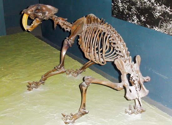 The Cumberland Bone Cave is a fossil-filled cave along the western slope of Wills Mountain. In 1912 workers excavating a cut for the Western Maryland Railway along Andy's Ridge broke into the partly filled cave. A local naturalist, Raymond Armbruster, observed fossil bones among the rocks that had been blasted loose and were being removed from the cut. Armbruster notified paleontologists at the Smithsonian Institution, and James W. Gidley began excavating that same year. The cave later became known as the "Cumberland Bone Cave". Between 1912 to 1916, Gidley excavated the Cumberland Bone Cave, where 41 genera of mammals were found, about 16 per cent of which are extinct. Numerous excellent skulls and enough bones to reconstruct skeletons for a number of the species were present. Skeletons of the Pleistocene Cave Bear and an extinct Saber-toothed cat from the Bone Cave are on permanent exhibit in the Ice Age Mammal exhibit at the National Museum of Natural History, Smithsonian Institution in Washington, DC.