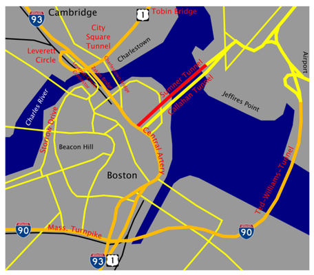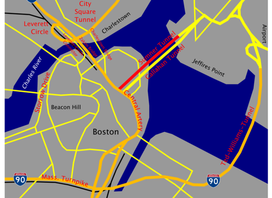 The Sumner Tunnel is a road tunnel in Boston, Massachusetts, United States. It carries traffic under Boston Harbor in one direction, from Logan International Airport and Route 1A in East Boston. The tunnel originally deposited traffic at the west side of the North End but with the completion of the Big Dig, it was modified to have two exits. One travels under I-93 and emerges on the west side of I-93 near Haymarket Subway Station. The other exit routes traffic to I-93 North and Storrow Drive. Traffic headed for I-93 South and the Massachusetts Turnpike West is normally routed to the Ted Williams Tunnel.