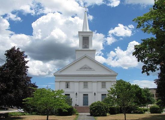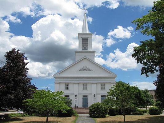 The First Congregational Church is an historic church located at 1 Church Street in Stoneham, Massachusetts. Built in 1840, it is a fine local example of Greek Revival architecture, and is a landmark in the town center. It was listed on the National Register of Historic Places on April 13, 1984. The church is affiliated with the United Church of Christ; the current pastor is the Rev. Meredith Allen.