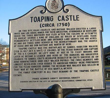 The Toaping Castle was a house in present-day Greenbelt, Maryland, built circa 1750 by Charles, Isaac and Nathan Walker, three brothers who fled to America from Scotland. The Walker brothers constructed the house on a 188-acre land grant in an area that eventually became Greenbelt. Samuel Hamilton Walker was born at Toaping Castle in 1817 and later served as a Texas Ranger and U.S. Army officer who died in the Mexican–American War.