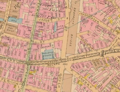 Franklin Square was a square in Manhattan on the intersection of Pearl, Dover and Cherry Streets. The elevated Manhattan Railway, built in 1877–1878, ran over Franklin Square, and a station was built there. On its west side were the buildings of Harper's Publishing House. The station and square were demolished in 1950, replaced with the Franklin Square Bridge, part of the Manhattan access to the Brooklyn Bridge. At the same time, the block of Cherry Street nearest the square was razed and replaced with the Alfred E. Smith Houses.