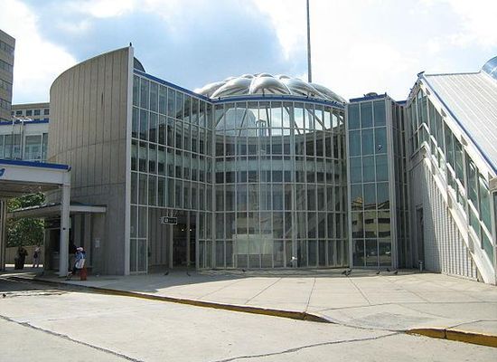 The Cumberland station was first proposed in 1972 as part of an extension of the Blue Line from Logan Square to O'Hare International Airport. The station opened on February 27, 1983, along with Harlem and Rosemont. The three new stations brought 6,000 new riders to the northwest CTA line in the following month, and Cumberland became especially attractive to suburban commuters. The station at Cumberland consists of a single island platform; a pedestrian overpass connects the platform to a station building to the south and an exit stairway to the north. The station also includes a bus terminal and a park and ride lot. Trains serve Cumberland 24 hours a day every day; the headway between trains is 10 minutes during peak periods, with less frequent service at other times. In addition to trains, Cumberland also serves CTA buses, Pace buses, Burlington Trailways buses, and Greyhound buses.
