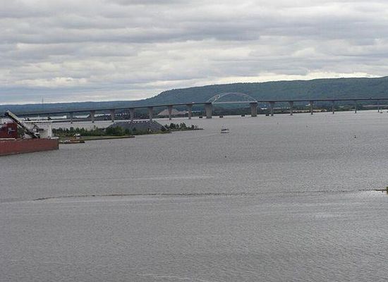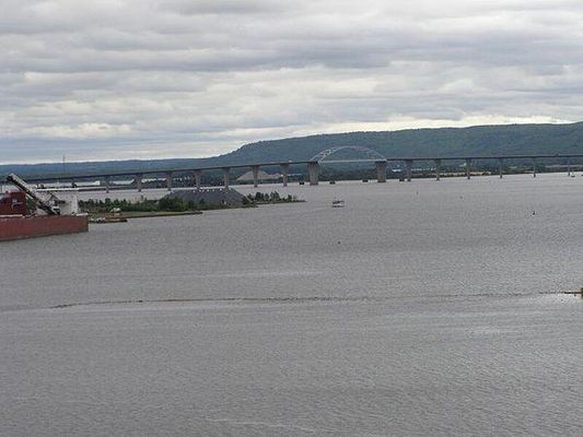 The Richard I. Bong Memorial Bridge, also known as the Bong Bridge, connects Duluth, Minnesota, and Superior, Wisconsin, via U.S. Route 2 . Opened on October 25, 1985, it is roughly 11,800 feet long, including about 8,300 feet over water. It crosses the Saint Louis Bay that drains into Lake Superior.