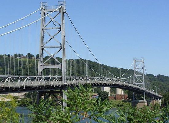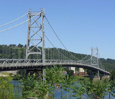 The Fort Steuben Bridge, originally the Weirton-Steubenville Bridge, was a suspension bridge which spanned the Ohio River from Steubenville, Ohio to Weirton, West Virginia and carried U.S. Route 22 and then Ohio State Route 822 during its existence. Completed in 1928 and opened as a toll bridge, the Fort Steuben Bridge was a more direct route for the flow of traffic across the river; particularly for trucks and heavy vehicles from the industrial area. The Fort Steuben Bridge was weight-restricted in 2006 and closed in 2009 due to deterioration. The bridge was demolished by Joseph B. Fay Co. on February 21, 2012.