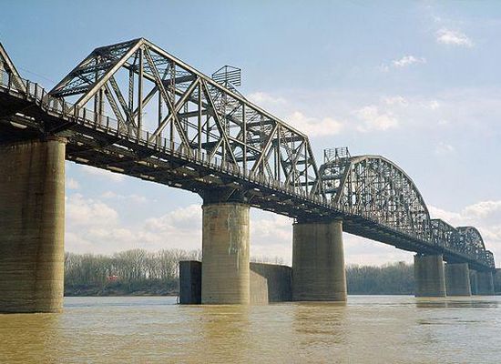The Kentucky & Indiana Bridge is one of the first multi modal bridges to cross the Ohio River. It is for both railway and common roadway purposes together. By federal, state, and local law railway and streetcar, wagon-way, and pedestrian modes of travel were intended by the City of New Albany, City of Louisville, State of Kentucky, State of Indiana, the United States Congress, and the bridge owners. The K & I Bridge connects Louisville, Kentucky to New Albany, Indiana. Constructed from 1881 to 1885 by the Kentucky and Indiana Bridge Company, the original K&I Bridge opened in 1886. It included a single standard gauge track and two wagon ways, allowing wagons and other animal powered vehicles to cross the Ohio River by a method other than ferry for the first time. At the time motorized vehicles were virtually nonexistent. The K&I Bridge company also owned a ferry boat operation during both the 1st and 2nd bridge; eventually that operation was sold as the bridge's success largely outmoded boat usage.