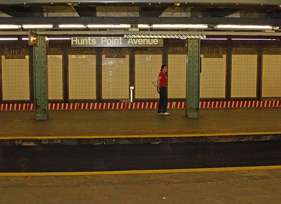 Hunts Point Avenue is an express station on the IRT Pelham Line of the New York City Subway, served by the 6 train at all times and the <6> train on weekdays in the peak direction. It is located at Hunts Point Avenue and Southern Boulevard in the Foxhurst neighborhood in the Bronx.