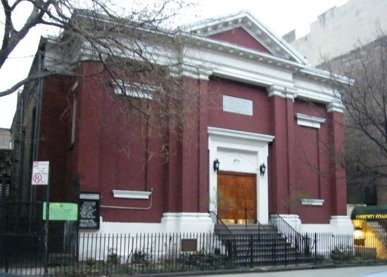 German Evangelical Lutheran Church of St. Mark is a historic church and synagogue building at 323 East 6th Street between First and Second Avenues in the East Village neighborhood of Manhattan, New York City. The Renaissance Revival style church was built in 1847 by the Evangelical Lutheran Church of St. Matthew which first rented it to St. Mark's and subsequently sold it to them in 1857. Much of the church membership was killed in the 1904 General Slocum disaster, and the congregation never recovered.