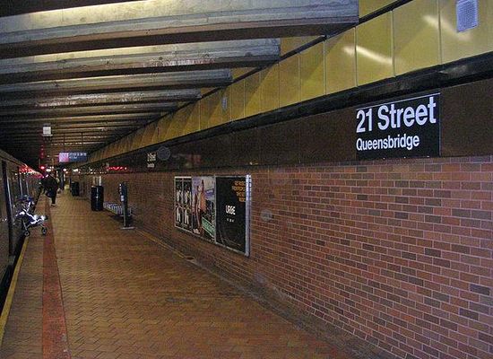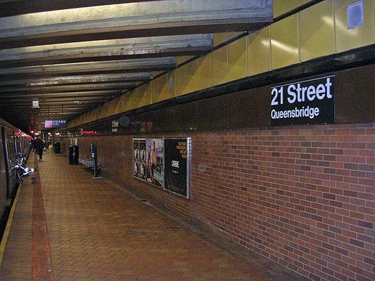 21st Street–Queensbridge is a station on the IND 63rd Street Line of the New York City Subway. Located at the intersection of 21st Street and 41st Avenue within Queensbridge in Long Island City, Queens, it is served by the F train at all times and the <F> train during rush hours in the peak direction.