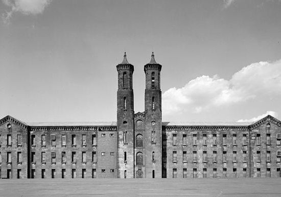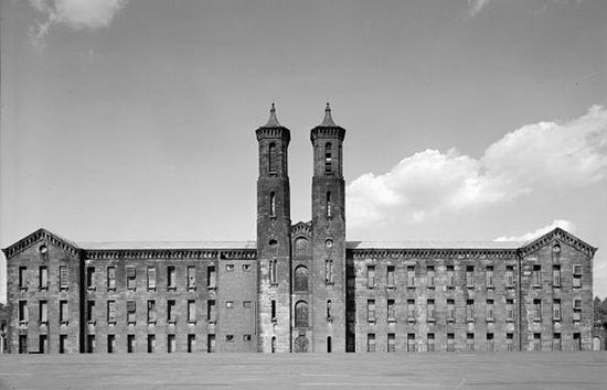 Construction of the Cannelton Cotton Mill began in 1849 and was completed in 1851. Designed by Rhode Island architect Thomas Alexander Tefft and built of sandstone, the mill was once the largest industrial building in the United States west of the Allegheny Mountains. It initially employed about 400 workers, mostly women and girls, and annually produced more than 200,000 pounds of cotton batting and four million yards of cotton sheeting. Of 309 workers employed there in 1890, only 78 were men. As late as 1900, the mill employed 35 girls and 19 boys under the age of 18.