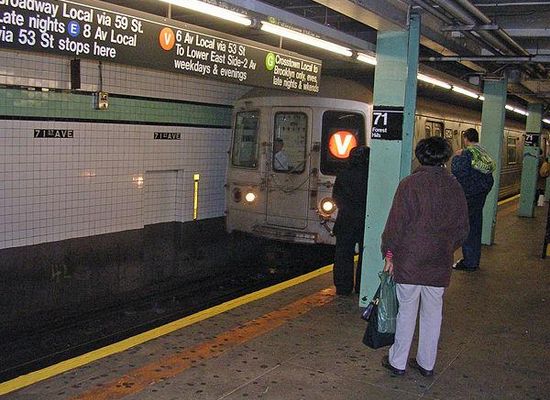 Forest Hills–71st Avenue is an express station on the IND Queens Boulevard Line of the New York City Subway, located on Queens Boulevard at 71st Avenue in Forest Hills, Queens. It is served by the E and F trains at all times, the <F> train during rush hours in the peak direction, the R train at all times except late nights, the M train on weekdays except late nights. It serves as the terminus for the latter two services.