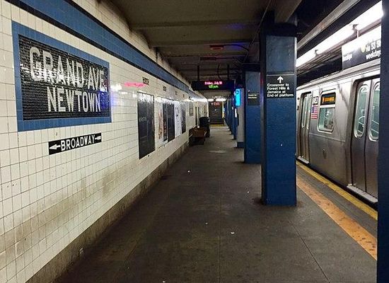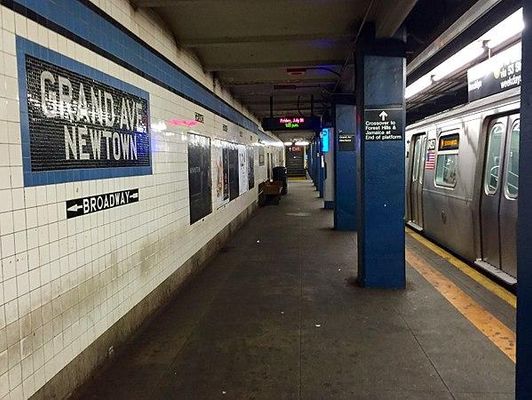 Grand Avenue–Newtown is a local station on the IND Queens Boulevard Line of the New York City Subway. Located under private property at the northeast corner of the intersection of Grand Avenue, Broadway, and Queens Boulevard in the neighborhood of Elmhurst, Queens, it is served by the M train on weekdays, the R train at all times except nights, and the E train at night.