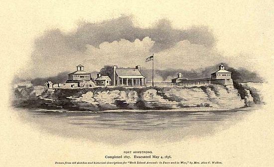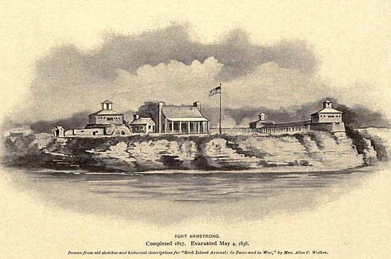 Fort Armstrong , was one of a chain of western frontier defenses which the United States erected after the War of 1812. It was located at the foot of Rock Island, Illinois, in the Mississippi River near the present-day Quad Cities of Illinois and Iowa. It was five miles from the principal Sac and Fox village on Rock River in Illinois. Of stone and timber construction, 300 feet square, the fort was begun in May 1816 and completed the following year. In 1832, the U.S. Army used the fort as a military headquarters during the Black Hawk War. It was normally garrisoned by two companies of United States Army regulars. With the pacification of the Indian threat in Illinois, the U.S. Government ceased operations at Fort Armstrong and the U.S. Army abandoned the frontier fort in 1836.