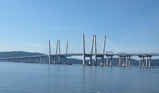 The Tappan Zee Bridge, officially named the Governor Mario M. Cuomo Bridge after former New York Governor Mario Cuomo, is a twin cable-stayed bridge spanning the Hudson River between Tarrytown and Nyack in the U.S. state of New York. It was built to replace the original Tappan Zee Bridge, which was located just to the south. The new bridge's north span carries the northbound and westbound automobile traffic of the New York State Thruway, Interstate 87 and I-287; it will also carry a shared-use path for bicycles and pedestrians. The south span carries southbound and eastbound automobile traffic.