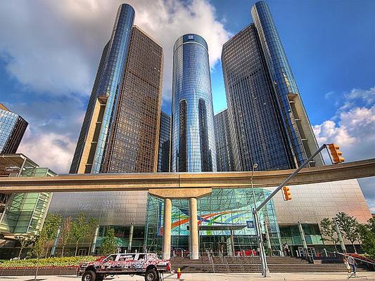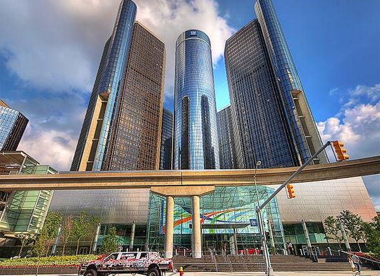 The Renaissance Center is a group of seven interconnected skyscrapers in Downtown Detroit, Michigan, United States. The Renaissance Center complex is on the Detroit International Riverfront and is owned by General Motors as its world headquarters. The central tower, the Detroit Marriott at the Renaissance Center, is the third tallest all-hotel skyscraper in the Western Hemisphere. It has been the tallest building in Michigan since it was erected in 1977.