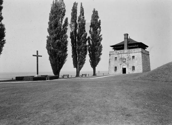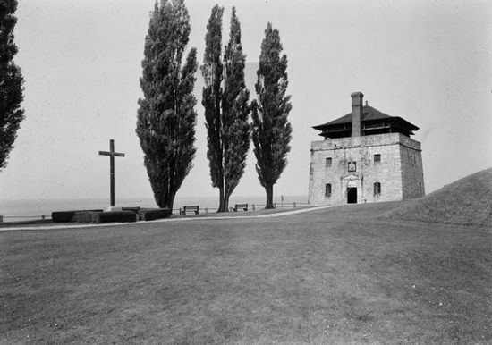 The Father Millet Cross is a memorial on the grounds of Fort Niagara in Youngstown, New York. The 18-foot (5.5 m) bronze cross is a replacement for the wooden cross erected by Pierre Millet at the New French Fort Denonville in 1688. During the preceding winter, disease and starvation overwhelmed the fort's garrison of a hundred men and only twelve of them were saved by a rescue party. Father Millet, a Jesuit missionary, as with this rescue party. On Good Friday (April 16) he celebrated Mass and erected and dedicated a cross invoking God's mercy for the plague-stricken men. On the beam of the cross is inscribed: "REGN. VINC. IMP. CHRS." or Regnat, Vincit, Imperat, Christus, or King, Conquering Commander, Anointed.
