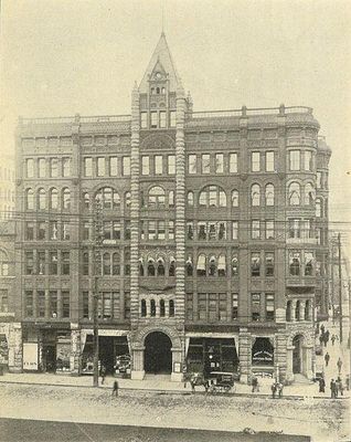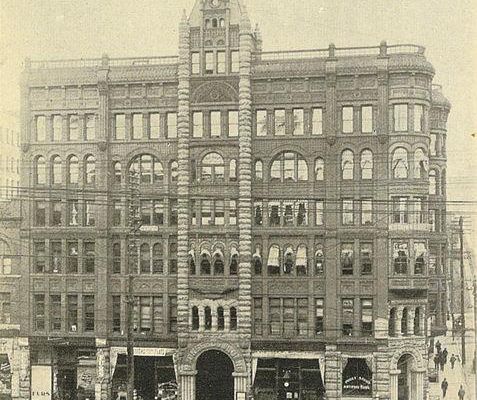 From Seattle's earliest days until the early 1880s, the corner of First and James was the site of Henry and Sarah Yesler's home and orchard, with his steam-powered sawmill located across the way. His home served as the center of social life and hospitality in early Seattle. As Seattle's business district began to grow rapidly in the early 1880s, Yesler moved to his new mansion, designed by architect William E. Boone, three blocks away at 4th and James in 1884. Rather than demolishing his old house and fully redeveloping his property, he moved the house to the back of the lot and filled his First Avenue frontage with displaced buildings purchased and relocated from across the street.