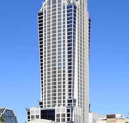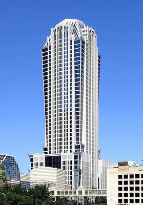 The Truist Center in Charlotte, North Carolina is a 47-story skyscraper along North Tryon Street that rises 201 meters in height. It opened on 14 November 2002 and is the 3rd-tallest building in Charlotte. The 32-story tower rests atop a 15-floor podium. Located within the podium is a three-story, 17,000-square-metre trading floor designed by Skidmore, Owings & Merrill and operated by Bank of America. The building is currently the headquarters of Truist Financial, who purchased the building in March 2020.