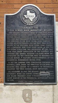 The Texas School Book Depository, now known as the Dallas County Administration Building, is a seven-floor building facing Dealey Plaza in Dallas, Texas. The building was Lee Harvey Oswald's vantage point in his assassination of United States President John F. Kennedy on November 22, 1963. Oswald, an employee at the depository, shot and killed President Kennedy from a sixth floor window on the building's southeastern corner; 30 minutes after the shooting, Kennedy died at Parkland Memorial Hospital. The structure is a Recorded Texas Historic Landmark, located at 411 Elm Street on the northwest corner of Elm and North Houston Streets, at the western end of downtown Dallas.