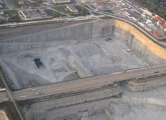 Thornton Quarry is one of the largest aggregate quarries in the world, located in Thornton, Illinois just south of Chicago. The quarry is 1.5 miles long, 0.5 miles wide, and 450 feet deep at its deepest point. Gallagher Asphalt Corporation has been operating on the grounds of the quarry since 1928. A dryland dike carries Interstate 80/Interstate 294/Tri-State Tollway over the quarry.