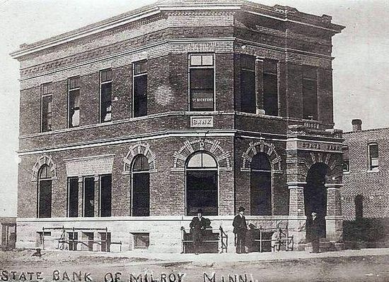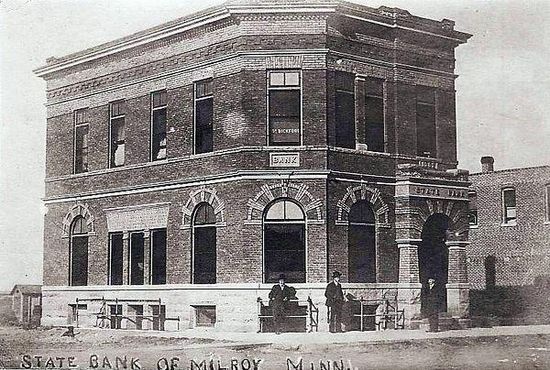 The Milroy State Bank Building is located in the small town of Milroy, Minnesota at the intersection of Superior Street and Euclid Avenue . The building was a former community bank built in 1902 by a group of businessmen from Springfield, Minnesota. It is nearly identical to the Clements State Bank Building in Clements, Minnesota representing the commercial investment of outsiders in a string of towns platted on a new railroad line, the Minnesota Western Branch of Chicago and North Western Railway.