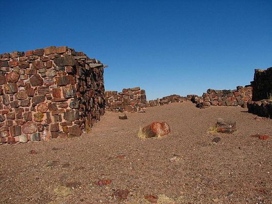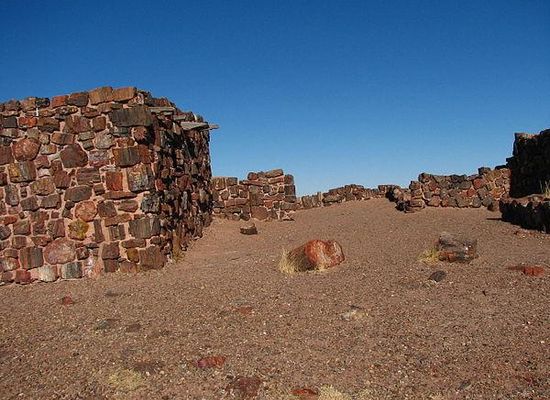 Agate House is a partially reconstructed Puebloan building in Petrified Forest National Park, built almost entirely of petrified wood. The eight-room pueblo has been dated to approximately the year 900 and occupied through 1200, of the Pueblo II and Pueblo III periods. The agatized wood was laid in a clay mortar, in lieu of the more usual sandstone-and-mortar masonry of the area.