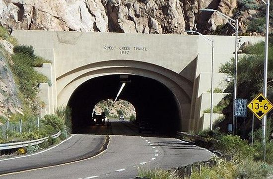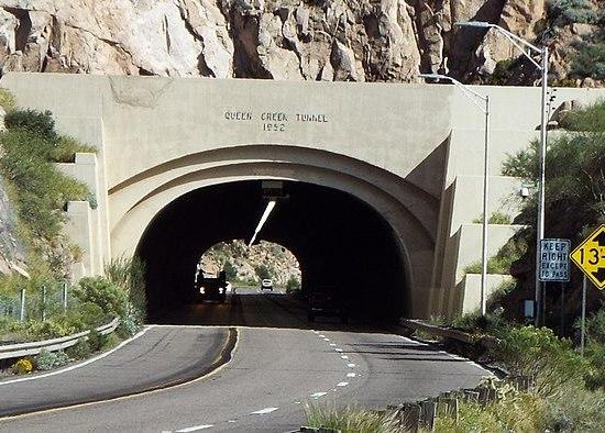 The Queen Creek Tunnel is a 1,217-foot-long tunnel on US 60 in the Superstition Mountains, just east of Superior, Arizona. Completed in 1952, the Queen Creek Tunnel links Phoenix with Safford by way of Superior and Globe/Miami. It replaced the smaller Claypool Tunnel that had been built in 1926. The new tunnel was cut through the solid rock of the Queen Creek gorge, approximately 3 miles from the 4,625-foot mountain summit.. It is 22 feet in height and 42 feet wide at its base. The cost of the tunnel at the time of its construction was $550,000 and it was built by the Fisher Contracting Company.