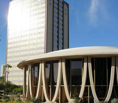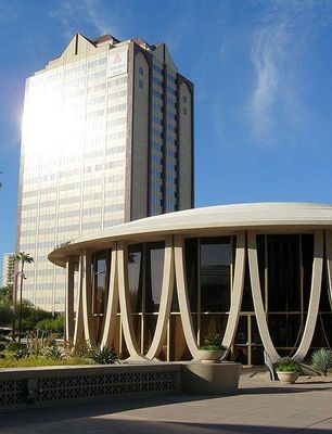 The Meridian Bank Tower is a high-rise building in Phoenix, Arizona. It is an office building designed in international style and constructed between 1959 and 1960 for developer David H. Murdock. Upon completion, it became the city's tallest building, taking that 31 year distinction away from the Westward Ho which opened in 1929. The Phoenix Corporate Center, a 26-story office building, was completed just a few years later in 1965 claiming the title as the city's tallest building. There is a 20 feet by 20 feet sign on the north and south sides with a Meridian Bank logo. The exterior was remodeled in the late 1980s which substantially changed the building's appearance.