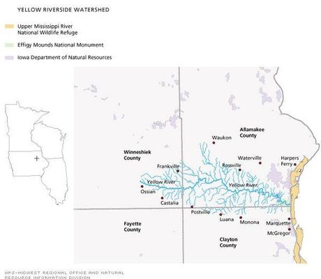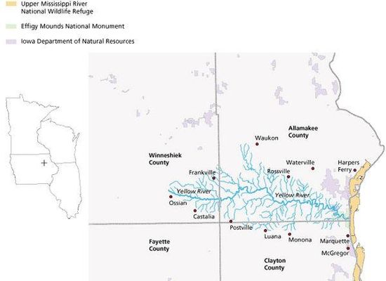 The Yellow River is a 53.5-mile-long tributary of the Mississippi River in northeastern Iowa. It originates in southwestern Winneshiek County and flows through southern Allamakee County, receiving tributaries from northern Clayton County, before joining the Mississippi near Marquette and Effigy Mounds National Monument.