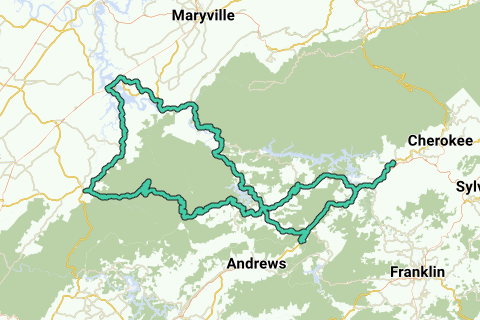 Bryson City, NC to Robbinsville, NC, Tail of the Dragon 129 north to Vonore, Tn 360 south to Tellico Plains, Tn, then 165 Cherohala Skyway to Robbinsville, NC and back to Bryson City, NC