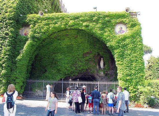 Grotta di Lourdes is an artificial cave in the Vatican gardens. It was built in 1902–05 and is a replica of the Lourdes Grotto in France. The context of building this grotto is the vision of the Madonna that a young girl, Bernadette Soubirous, experienced 18 times. Prior to that the Pope had promulgated the dogma of the Immaculate Conception in 1854.