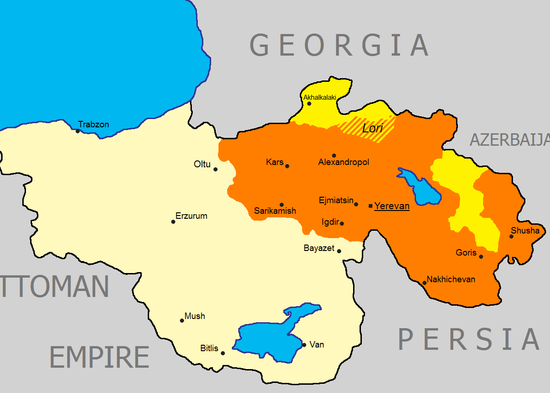 En 1918, la nueva república se enfrentó al Imperio otomano en la Primera Guerra Mundial durante la campaña del Cáucaso, que terminó con el Tratado de Batum. Este tratado fue el primer acuerdo internacional de la República Democratíca de Armenia, firmado en el mismo día de la declaración internacional de la república. Con la derrota del Imperio otomano al final de la Primera Guerra Mundial, los Estados Unidos y Woodrow Wilson propusieron en la Conferencia de Paz de París de ampliar las fronteras de la República Democrática de Armenia a fin de incluir las regiones de la Armenia histórica, este nuevo territorio, también fue conocido como Armenia Wilsoniana, fue ratificado por el Tratado de Sèvres. Sin embargo, este tratado nunca se puso en práctica y el destino de los territorios se determinó por el Tratado de Alexandropol, después el Tratado de Kars y, finalmente, el Tratado de Lausana.