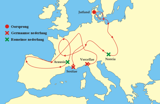 Los cimbrios y teutones abandonaron sus tierras natales alrededor del mar Báltico, en la península de Jutlandia, al sur de Escandinavia. Viajaron hacia el sureste, donde se encontraron con los escordiscos, con quienes lucharon. Tras obtener la victoria, siguieron avanzando hasta llegar al Danubio, en el Nórico , hogar de los tauriscios, y aliados de Roma. Incapaces de repeler a los nuevos invasores, los tauriscios solicitaron ayuda romana. El cónsul Cneo Papirio Carbón respondió dirigiendo a sus legiones hacia Noricum , acampando cerca de Aquilea.[2]