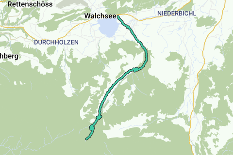 El camino lleva desde el aparcamiento en la orilla este del Walchsee hasta la Feldalm en aproximadamente 3 horas de tiempo de caminata.