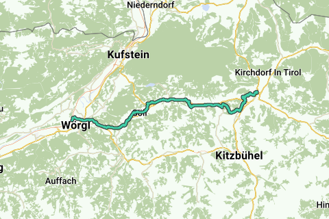 El camino del Wilder Kaiser comienza en la gran iglesia parroquial de St. Johann in Tirol. A través de pequeños pueblos, la ruta se dirige inicialmente hacia arriba a Going. Con el imponente Kaiser a la derecha, uno pasa por paisajes pintorescos. Desde Going, el camino continúa hacia Ellmau, donde estos dos pueblos son el escenario de la serie de televisión, el doctor de montaña Martin Gruber, interpretado por Hans Sigl. Ahora se desciende en dirección a Scheffau y más allá, al pueblo vecino de Söll. Con el Wilder Kaiser a la espalda, a la izquierda se eleva la Hohe Salve (1.829 metros). A través de la aldea de Pirchmoos, los ciclistas llegan a Kirchbichl/Bruckhäusl. El valle se vuelve notablemente más ancho y pronto se alcanza el destino, Wörgl.