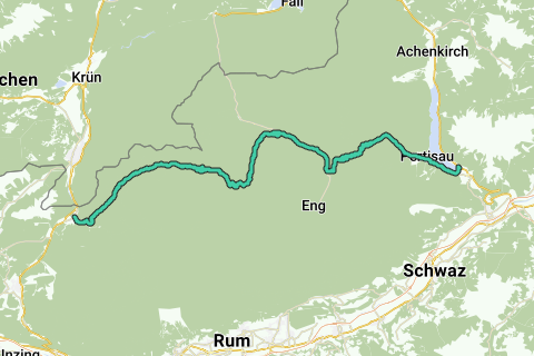 Después del inicio, se pedalea primero un kilómetro hacia el valle antes de desviarse a la izquierda por la pista forestal hacia el Karwendelhaus. Sin desvíos, se recorre el valle de Karwendel hasta el Karwendelhaus. Solo es una breve subida hasta el Hochalmsattel. Después de un descenso, se llega al Kleiner Ahornboden y se continúa por bien acondicionadas pistas forestales a través del Johannestal en dirección a Hinterriß. Al llegar al Rißtal, se pedalea río adentro hasta el desvío hacia el Plumsjoch. Ahora se asciende nuevamente unos 500 metros de desnivel hasta la cabaña Plumsjoch. Después de una parada, hay un descenso técnicamente difícil (Singletrail Plumsjoch o carretera de empuje) al Gerntal y luego, por una carretera asfaltada, hacia Pertisau. Tras atravesar el pueblo, se pedalea directamente junto al Achensee por un carril bici hasta el destino de la etapa en el aparcamiento de la instalación recreativa Atoll Achensee en Maurach-Buchau.
