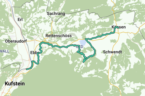 Primero se sigue durante 2 kilómetros el camino ciclista a lo largo del Inn, antes de girar a la derecha hacia Oberndorf - Ebbs. Se atraviesa el pequeño pueblo y posteriormente, se orienta uno siempre por los indicadores verdes del camino ciclista con el logo de Bike Trail Tirol. A través de praderas y bosques se pasa ahora junto a Ebbs en dirección a Walchsee. Justo antes del caserío de Durchholzen se alcanza la carretera federal y se pedalea por ella 1,5 km a través del pequeño pueblo (1,5 h desde el comienzo de la etapa) hasta que se gira nuevamente sobre el camino ciclista (n.º 15) en dirección a Walchsee. Justo antes del Walchsee, en el caserío de Oed, se gira a la derecha del camino ciclista en dirección al Habersautal (323). Ahora sigue un ascenso de 350 metros de altitud hacia la Gwirchtalm, de allí se desciende al Habersautal y se continúa hasta la carretera principal en Walchsee (1,5 h desde Durchholzen). Por esta se avanza aproximadamente un kilómetro hacia el este hasta que se gira a la izquierda en el camino ciclista hacia Kössen (15). A partir de ahora se sigue siempre las indicaciones del camino ciclista hacia Kössen hasta el centro (1 h desde Walchsee).