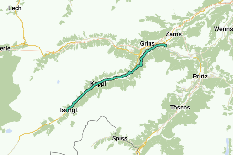 Desde el centro de Landeck se viaja brevemente por la carretera principal hacia el sur, antes de cruzar el Inn por el puente de madera. Aquí se sigue las señales verdes de ciclismo en dirección a Zams, pasando por el edificio judicial hasta que en un cartel amarillo de senderismo se gira a la izquierda hacia Zirmegg. A continuación, se sigue un camino asfaltado en ascenso hasta alcanzar la carretera hacia Tobadill. Por esta se continúa subiendo hasta Tobadill (1 hora desde Landeck). En total, se pedalea principalmente en subida hasta el pequeño pueblo de Hintergiggl. Allí se abandona la carretera asfaltada y se sigue un tramo de empuje por el "sendero circular See-Dorf" en un camino forestal hasta el pequeño pueblo de Frodenegg. Ahora se siguen los carteles amarillos en la carretera de acceso hasta bajar a See (1 hora 15 minutos desde Tobadill). En el pueblo se pedalea 400 metros por la carretera del valle hacia el interior, hasta que se gira a la derecha hacia el aparcamiento de los teleféricos de See. Aquí, el recorrido asciende brevemente por la ruta ciclista 743. Sin embargo, tras unos pocos cientos de metros, se gira a la izquierda en el camino del valle de Paznaun (ruta ciclista 737). Ahora se sigue los carteles mayoritariamente amarillos en la ladera soleada hasta Kappl (1,5 horas desde See). La etapa continúa a lo largo de la ladera soleada por la ruta ciclista Kappl-Ischgl (741) hasta el centro de Ischgl (1 hora 15 minutos desde Kappl).