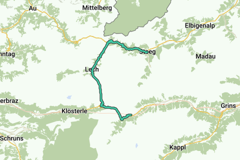En aproximadamente una hora y cuarto se llega a St. Christoph a través de la carretera de Arlberg, justo antes del paso. Luego, hay aproximadamente 3 kilómetros en descenso hasta el desvío de la carretera hacia Zürs y Lech. A través de galerías de avalanchas, pedaleas hacia arriba hasta el paso de Flexen, y después de eso, ligeramente en descenso primero a través de Zürs y luego a Lech hasta Warth (1 hora y 45 minutos desde St. Christoph). Aquí, te desvías a la derecha en la rotonda hacia la carretera federal de Lechtal en dirección a Reutte y permaneces en esta hasta Steeg (45 minutos desde Warth). ¡Atención: Para el viaje a través de las galerías de avalanchas es necesario tener iluminación en la bicicleta!