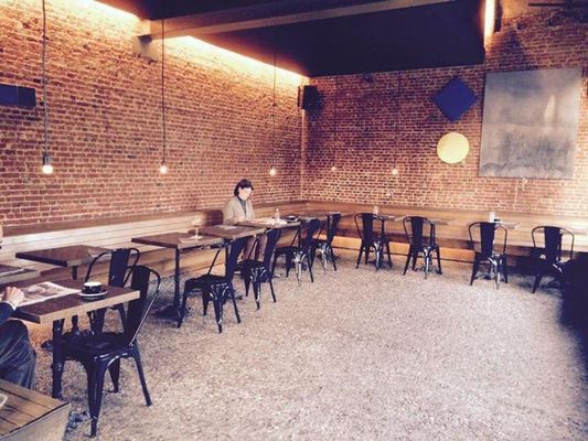 El café Kalifornia está ubicado en una hermosa antigua cochera que alguna vez funcionó como fábrica de sopa para las sopas California.