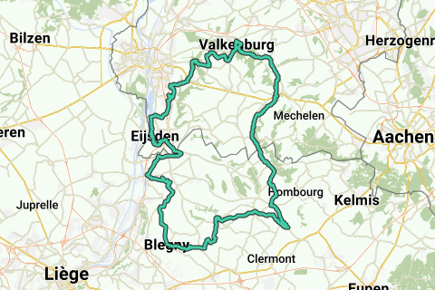 Inicio/fin: esquina Markstraat/Rijksweg Gulpen. Ascensos: Gracht Burggraaf Gulpen. Daalhemerweg Valkenburg a/d Geul. Rue de Mons Visé (B). Rue de Mons (parte) Bombaye (B). Côte de Feneur Feneur (B). Verte Voie (parte) Blégny (B). Trixes de Moines (parte) Bolland (B). Privôt (parte) Charneux (B). Wadeleux Val-Dieu (B). Bushaye Val-Dieu (B). Birven Aubel (B). Metros de altitud: 892. Parada de café: brasserie mijnmuseum Blégny, Blégny (B).