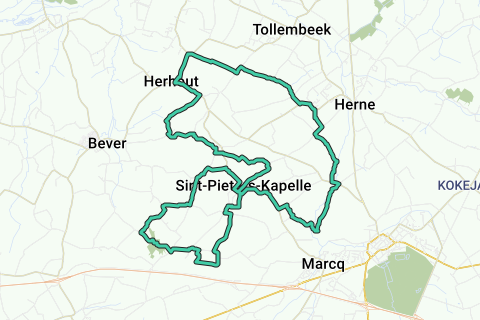 El lazo azul tiene una distancia de 26 km y puede comenzar en Herne o en el punto de inicio en Sint-Pieters-Kapelle en la zona de juegos De Wippewei. En Sint-Pietes-Kapelle encontrarás de nuevo el cubo paisajístico De Dulle Griet.
